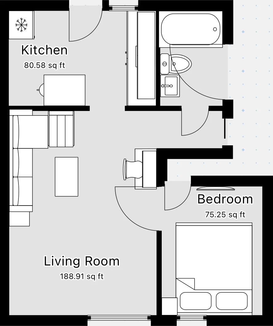 A smartly designed 400 sq ft space with everything you need for a comfortable stay.